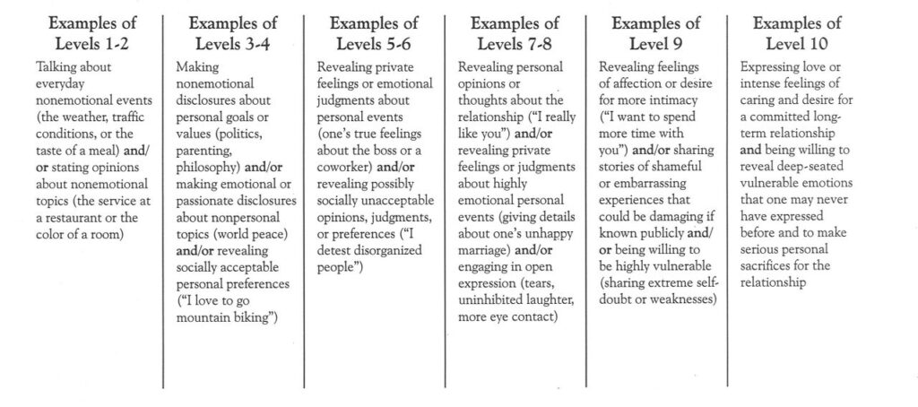 Si vous vous sentez à l’aise, que vous estimez que la relation peut monter d’un cran, montez d’un niveau de vulnérabilité. Passez de parler de la météo à parler d’un hobby. Et si l’autre parle d’un hobby en retour ou d’un élément du même ordre, et qu’une fois de plus vous le sentez, vous pourrez passez à au niveau supérieur, etc.